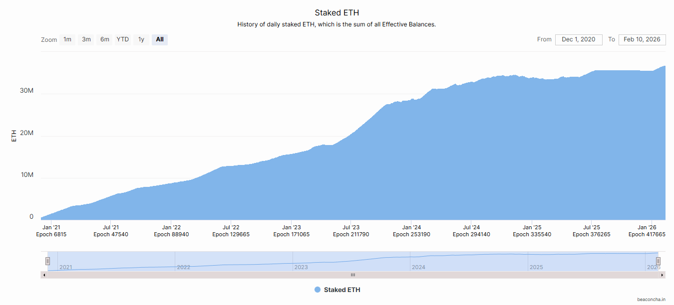 La señal más clara de esta tendencia se refleja en las cifras de staking. Actualmente, hay unos 36,7 millones de $ETH bloqueados en el sistema. Esto equivale al 30,3 % de todo el Ether disponible.