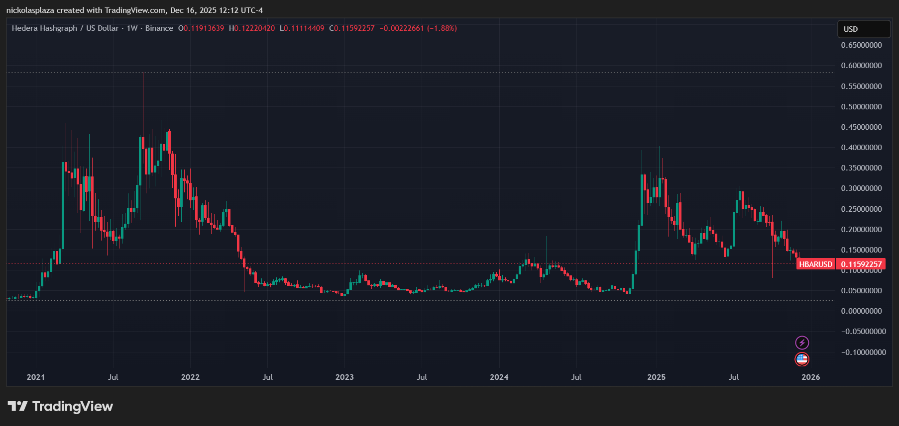 El precio máximo alcanzado por hedera fue 0,58 dólares en 2021. Fuente: TradingView.