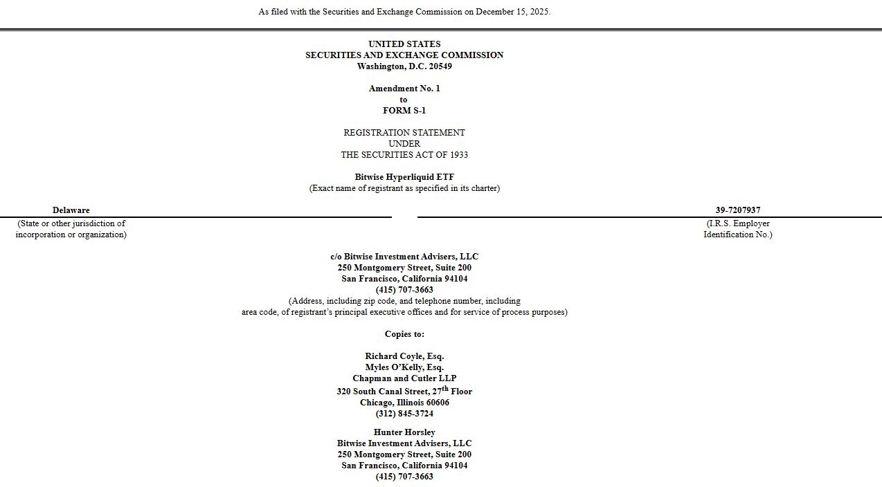 Bitwise, una empresa de gestión de activos digitales, realizó cambios en la solicitud del registro de su fondo cotizado en bolsa (ETF) basado en la criptomoneda hyperliquid (HYPE).