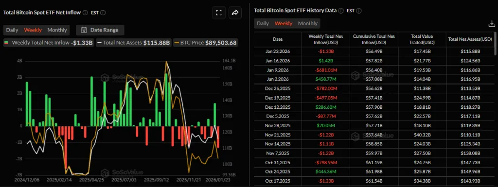 Динамика притоков в крипто-ETF тоже оказалась отрицательной. Из спотовых биткоин-фондов инвесторы вывели $1,33 млрд, из Ethereum-продуктов — $611 млн.