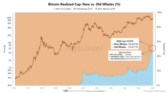 Исследователь CryptoQuant Хулио Морено обратил внимание, что впервые в истории доля «новых» китов в реализованной капитализации первой криптовалюты превысила долю долгосрочных держателей.