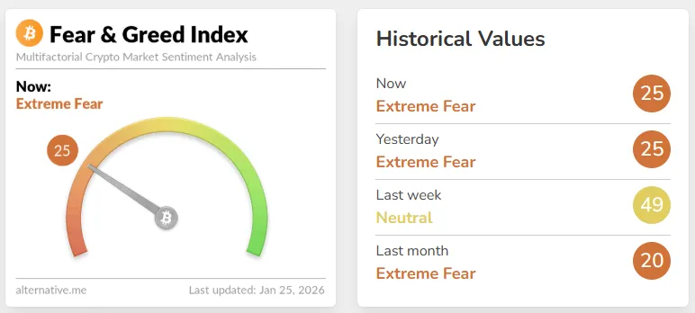Криптовалютный индекс страха и жадности вернулся в зону «экстремального страха» — 25 баллов. На прошлой неделе показатель находился около 50.