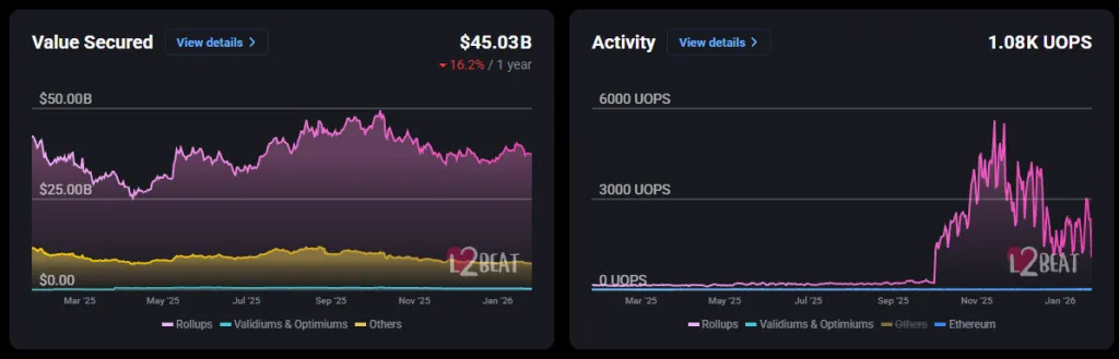 Параллельно наблюдается отток ликвидности из второго уровня. Согласно данным L2Beat, совокупный TVL экосистемы роллапов снизился на 16% за год и составляет $45 млрд.