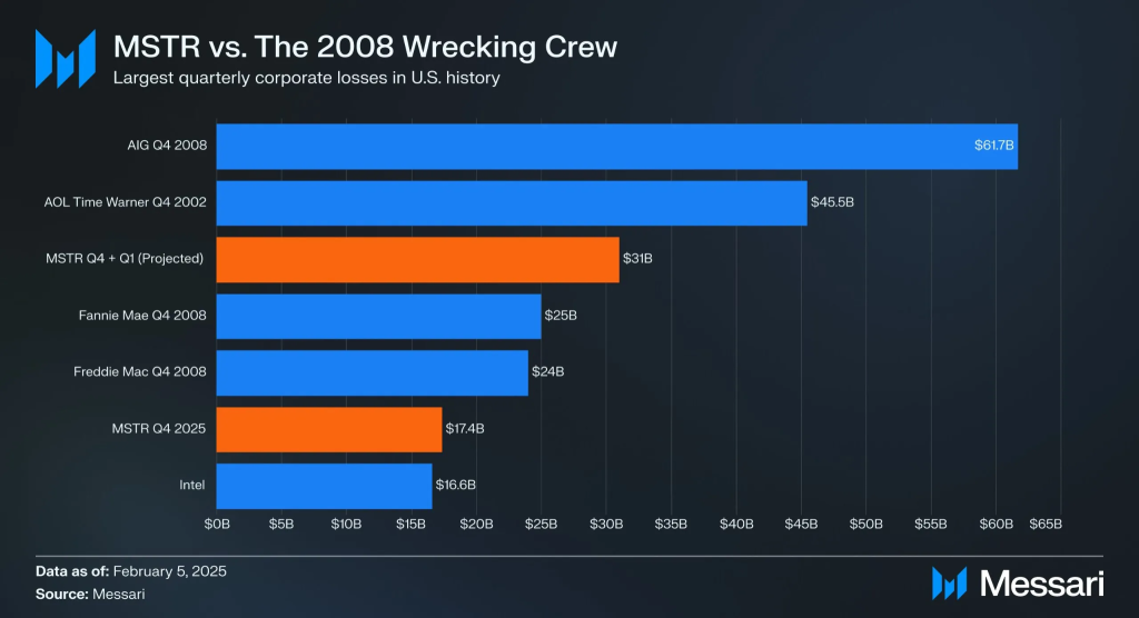 Согласно отчету Messari, текущий убыток Strategy сопоставим с потерями гигантов вроде AIG, Fannie Mae и Freddie Mac во время кризиса 2008 года.