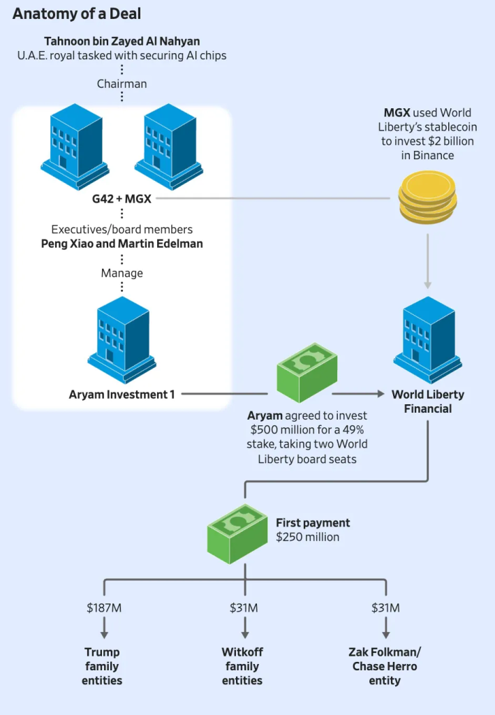 Журналисты также раскрыли, что за несколько недель до объявления администрации Трампа о соглашении с ОАЭ по ИИ-чипам компания шейха Тахнуна MGX инвестировала в Binance около $2 млрд в стейблкоине $USD1 от $WLFI. Эти действия фактически сделали возможным сам запуск актива.