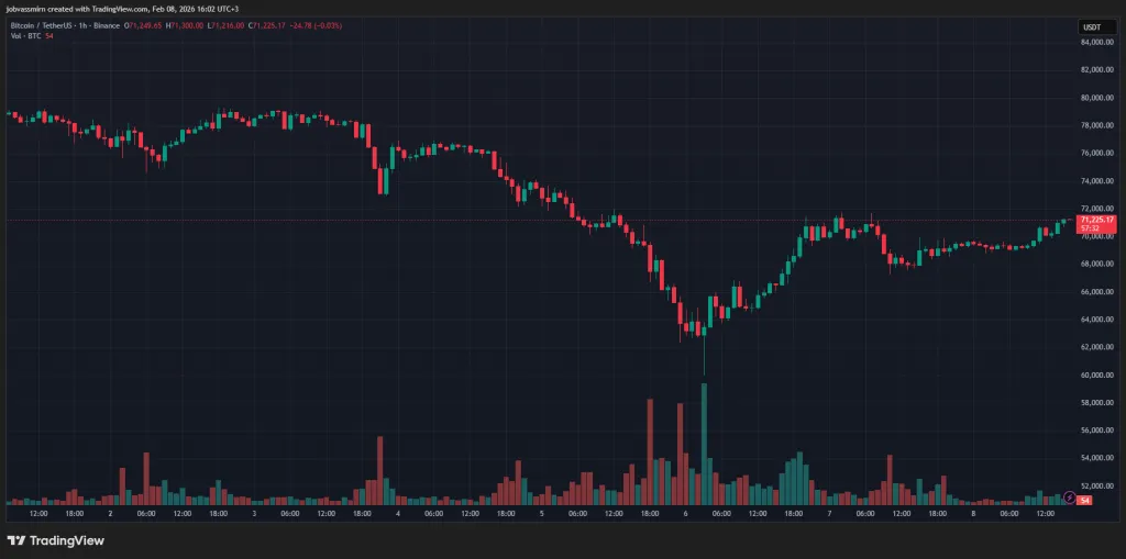 В пятницу, 5 февраля, случился самый глубокий сброс за неделю: первая криптовалюта просела с $73 000 до $60 000.