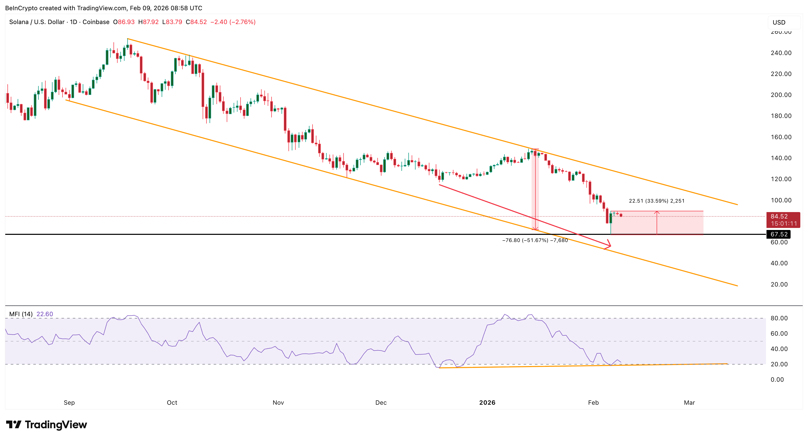 Цена Solana показала уверенное восстановление после значительного снижения. Котировки опустились к нижней границе нисходящего канала в начале февраля. Однако актив нашел надежную поддержку в районе $67 и вырос более чем на 30%. Данный импульс был обеспечен покупками на спаде.