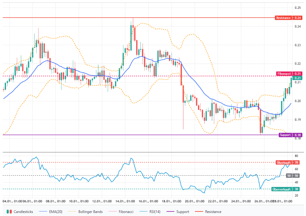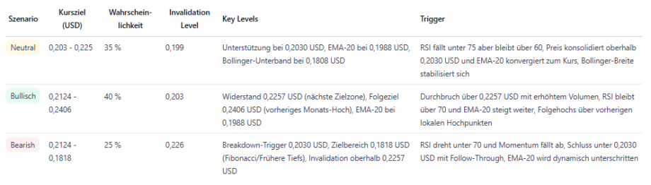 Die kurzfristige Prognose bleibt bullisch, allerdings besteht erhöhtes Rückschlagrisiko wegen des stark überkauften RSI. Wichtige Unterstützungen liegen bei 0,2030 USD und 0,1988 USD (EMA‑20); relevante Widerstände bei 0,2128 USD und 0,2257 USD.