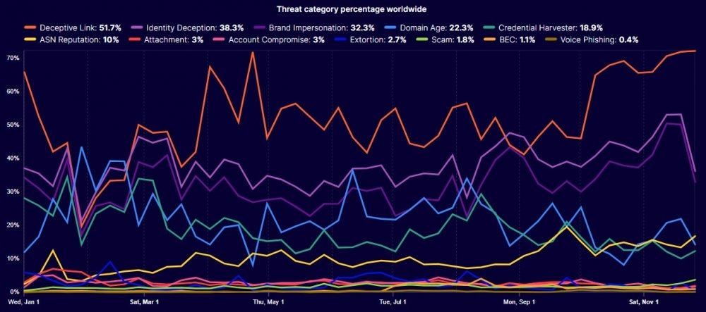 Как показало исследование, более половины (52%) вредоносных писем содержали обманные ссылки — это самая распространенная угроза. На втором месте по частоте — подделка личности (38%), что выше показателя 2024 года (35%). Злоумышленники имитируют доверенных лиц, используя поддельные домены, домены, похожие на настоящие, или манипулируют отображаемым именем отправителя.