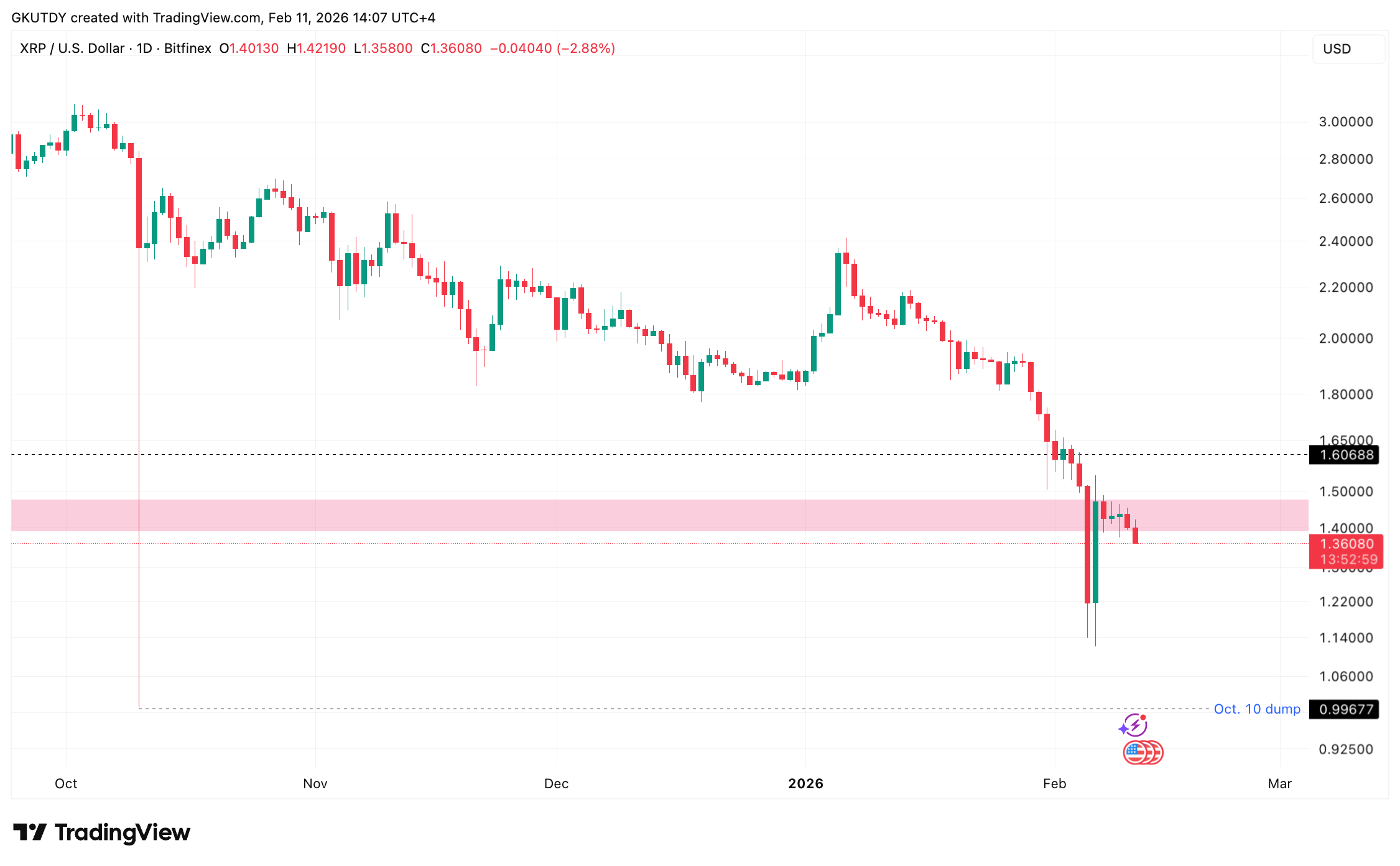 The sell-off in February has already pushed price below the $1.60688 per $XRP level marked on the chart, and it is now pressing into the $1.35-$1.45 zone, with the October low near $0.99677 as the next major support if weakness continues.