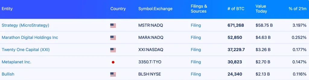 Strategy остается крупнейшим публичным держателем цифрового золота. Под ее управлением 671 268 BTC стоимостью $58,7 млрд.