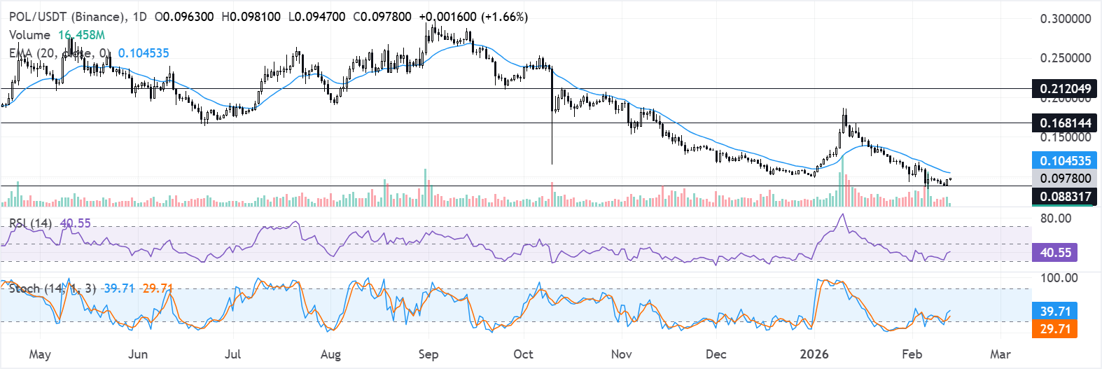 En el gráfico diario, $POL/$USDT se cotiza a 0.097$. La EMA de 20 días en 0.104$ se inclina hacia abajo y limita los intentos de recuperación, manteniendo la tendencia a corto plazo bajo presión. El precio permanece por debajo de este promedio, que continúa restringiendo los rallies. El RSI en 41, por debajo de la línea media, refleja un impulso moderado, mientras que el Stoch cerca de 40 ha comenzado a subir, insinuando una estabilización tentativa. La resistencia inmediata se alinea en 0.168$, mientras que el soporte se observa en 0.088$.