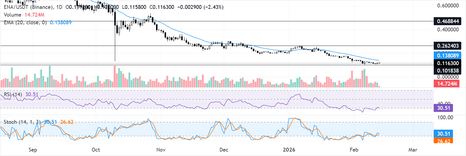 En el gráfico diario, la EMA de 20 días en 0.138$ se inclina hacia abajo y limita los rebotes, manteniendo la tendencia a corto plazo bajo presión. El precio permanece por debajo de este indicador, y los cierres sostenidos por debajo de él preservan un sesgo bajista. El soporte se observa en 0.101$, con resistencia en 0.262$ y 0.468$.