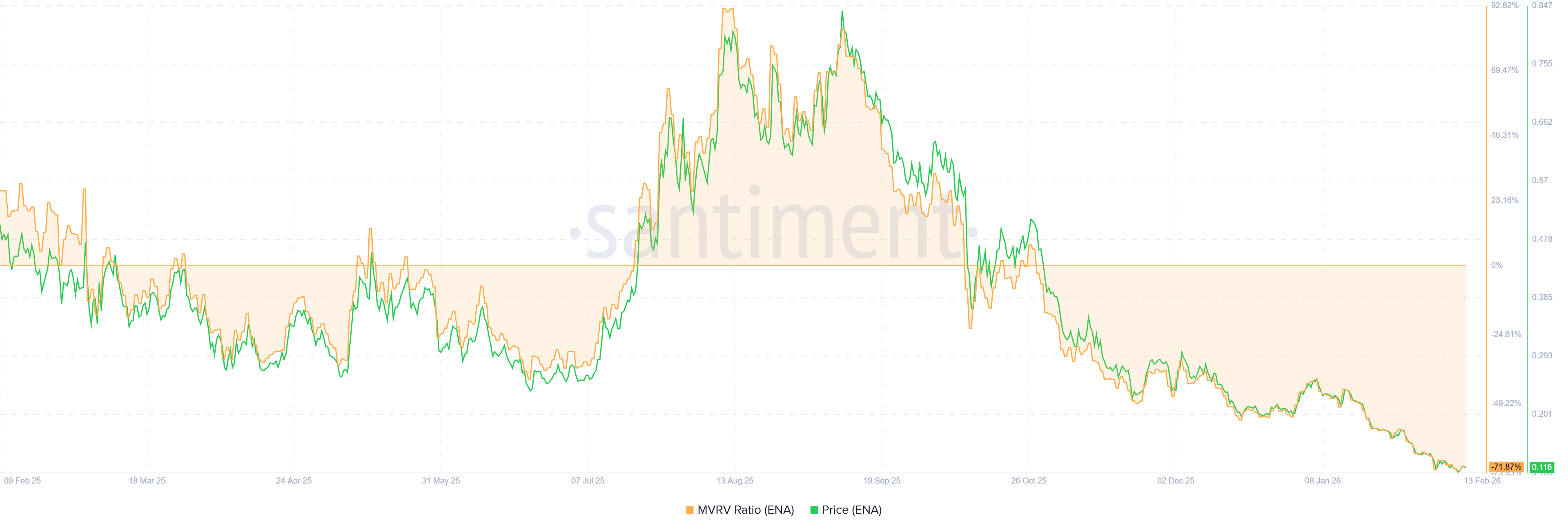 El movimiento se produce mientras los inversores de $ENA están en promedio con una pérdida de aproximadamente el 70%. Las grandes pérdidas no realizadas podrían indicar que los niveles de precios actuales representan un fondo o un menor riesgo a la baja, según datos de Santiment.