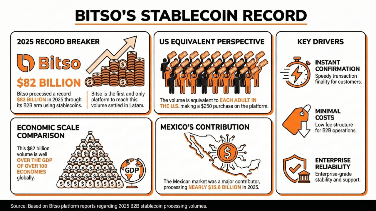 Bitso processed $82 billion in stablecoin payments through its B2B platform, making it the first exchange in Latin America to reach this volume. -