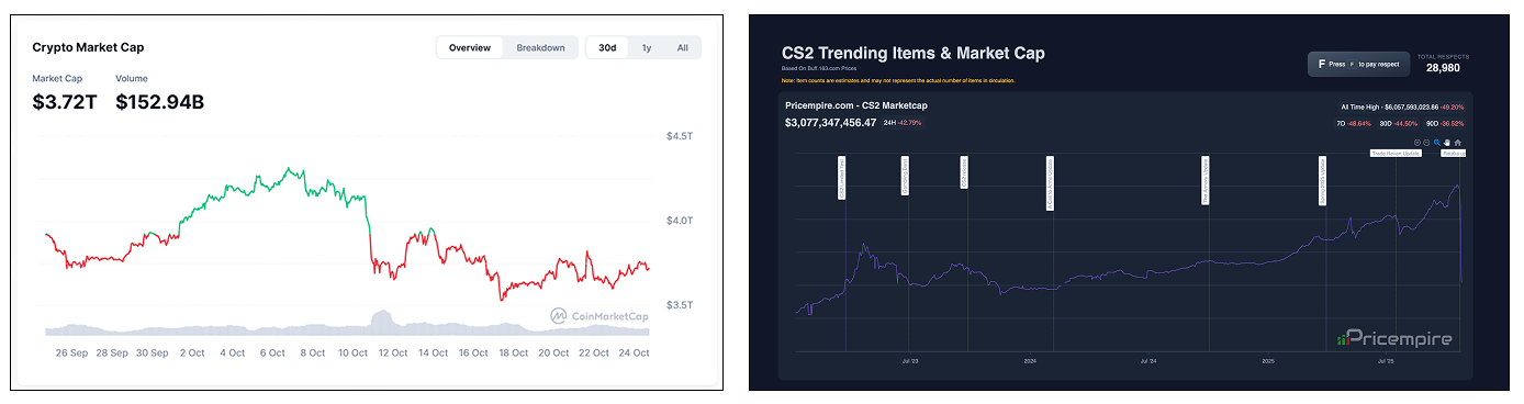 Криптовалюты обошли скины CS2 по рыночной капитализации. Источник: Priceprime/CoinMarketCap.