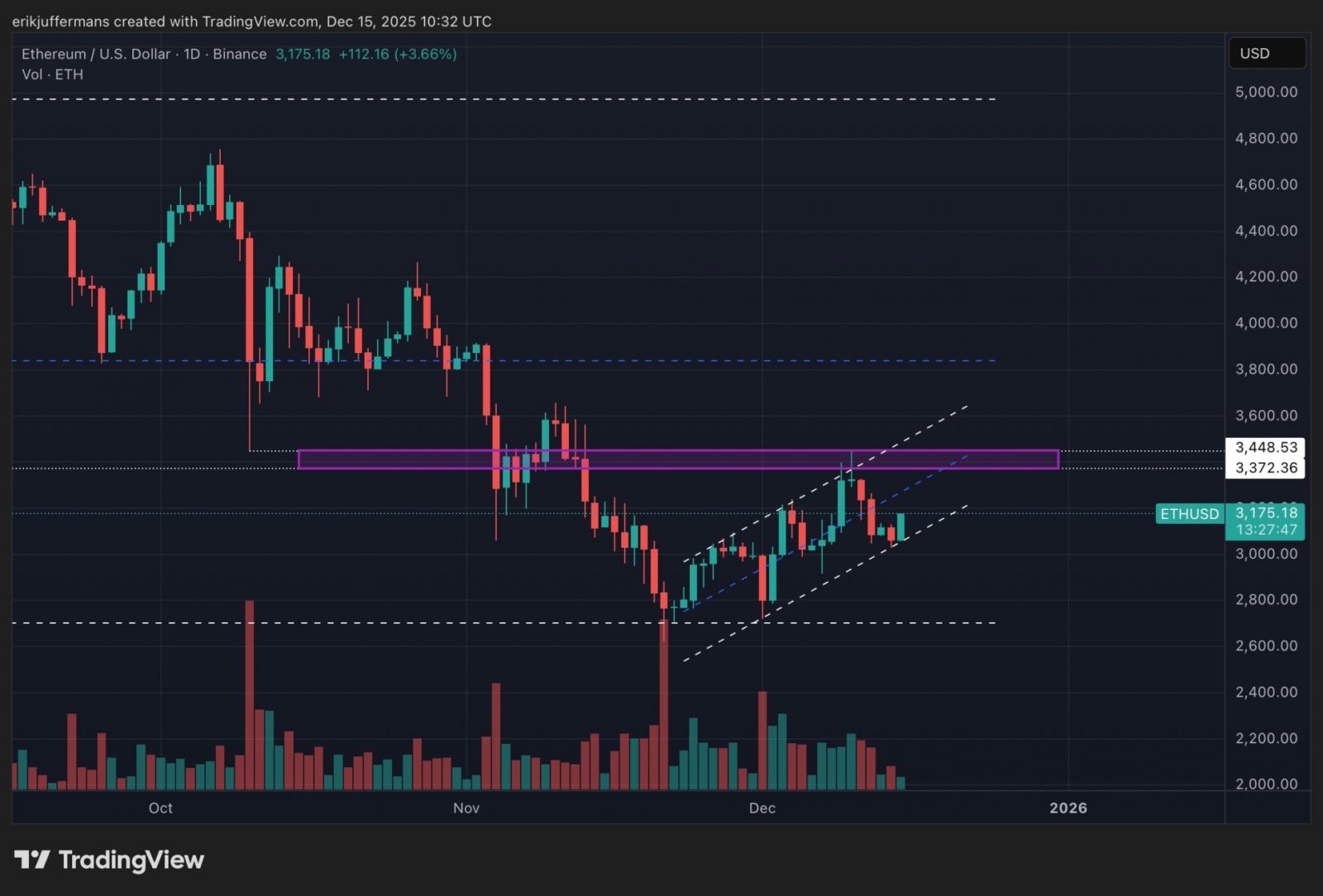 Ethereum (ETH) zeigt erneut eine stärkere Performance als Bitcoin (BTC). Während BTC leicht abnimmt, nähert sich ETH bedeutenden Widerstandszonen. Laut einem Newsbit-Analysten weist das Diagramm auf anhaltendes Momentum hin, mit einem möglichen Kursziel von 3.800 US-Dollar für die kommenden Wochen.