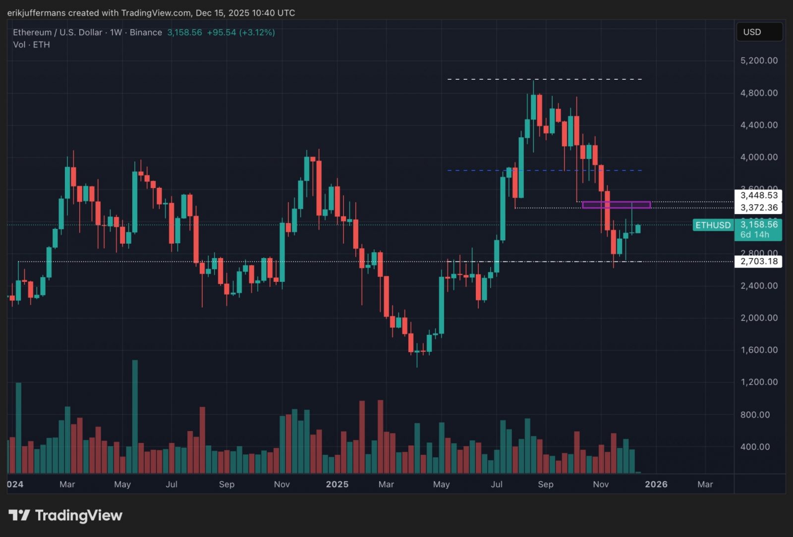 In der wöchentlichen Grafik ist die aktuelle Situation etwas übersichtlicher. Hier sehen wir auch, dass die jüngste Abwärtsbewegung in Richtung 2.700 US-Dollar eine tiefe, aber gesunde Korrektur war, wobei der Kurs ein schönes Higher Low notierte. Auch die Bedeutung der Zone um 3.800 US-Dollar ist hier deutlich zu sehen. Diese Zone bildete im März, Mai und Dezember letzten Jahres starken Widerstand.