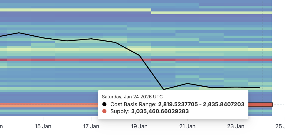 Un muro de la base de costos se forma cuando mucha cantidad de ETH fue comprada antes en un rango de precios ajustado. Cuando el precio vuelve a esa zona o se acerca, los holders suelen vender para quedar en equilibrio. Ese tipo de distribución temprana genera una fuerte resistencia, incluso si el sentimiento es alcista.