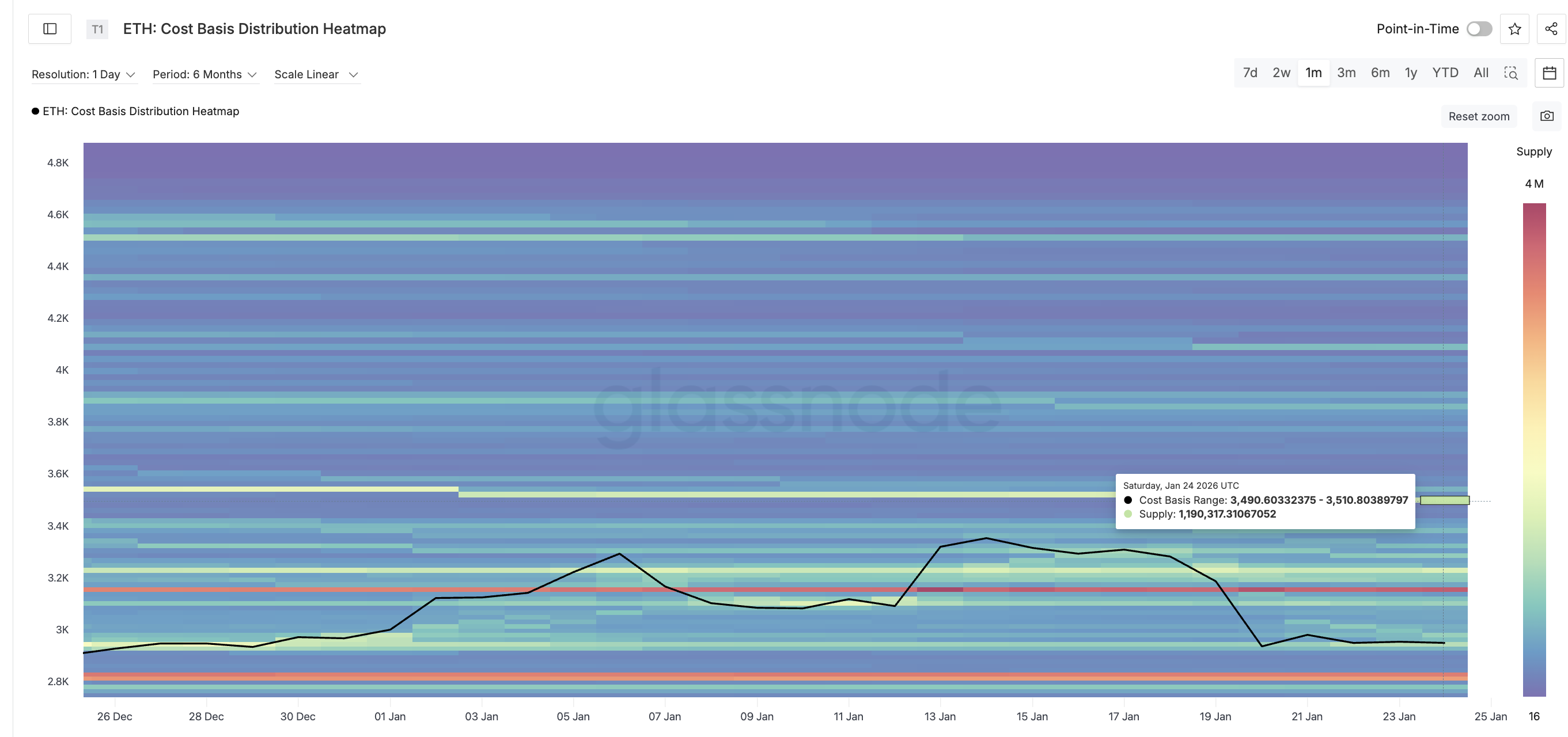Falló porque el precio se topó con un denso muro de costo base. Los datos de la base de costos muestran un gran grupo de holders de Ethereum entre 3,490 y 3,510 dólares. Aproximadamente 1,190,317 ETH se acumularon en esta zona. A un precio promedio cerca de 3,500 dólares, eso representa alrededor de 4,1 mil millones de dólares en suministro.