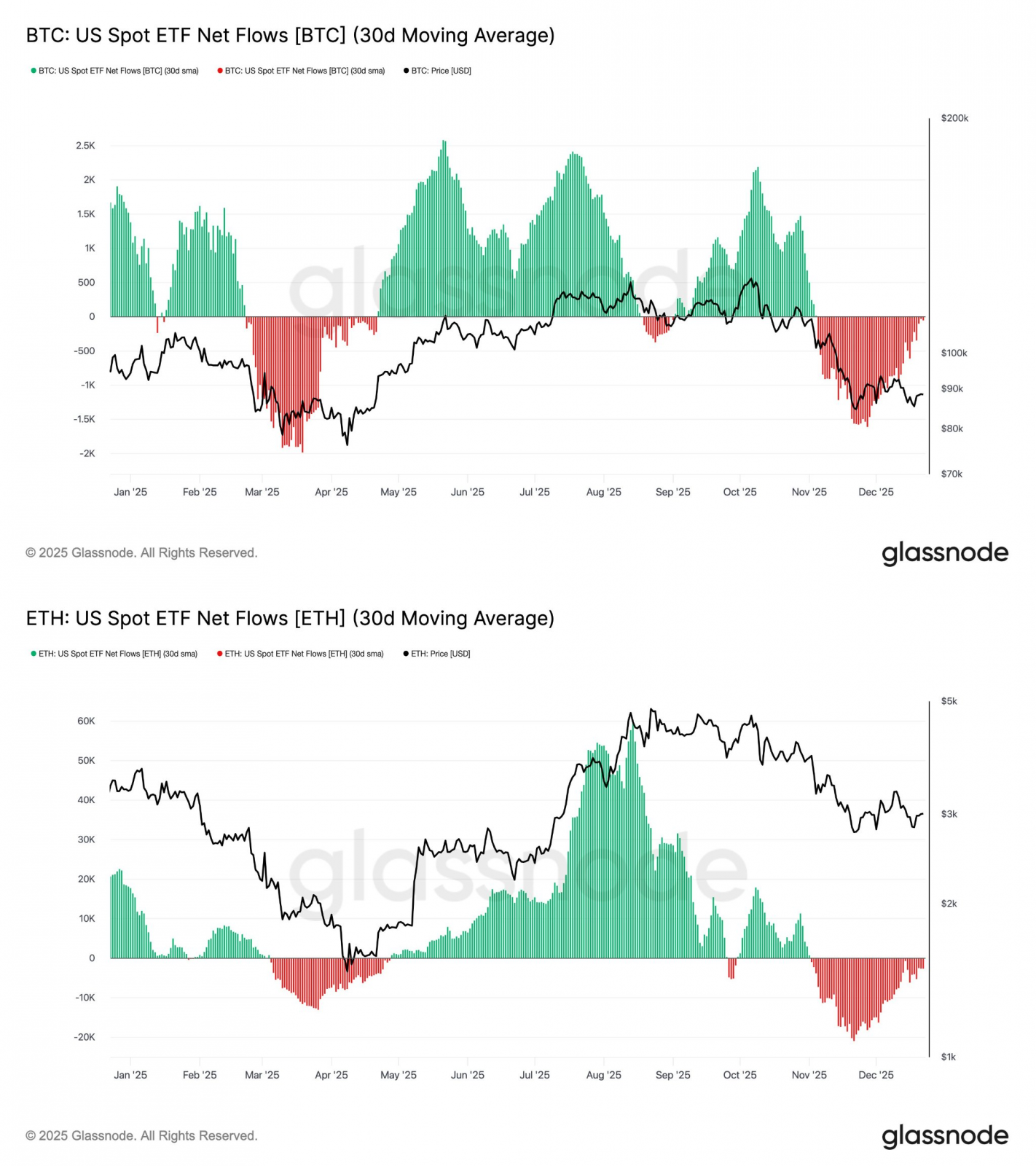 Динамика чистых потоков в BTC-ETF и ETH-ETF, 30-дневная скользящая средняя. Источник: BitBull.