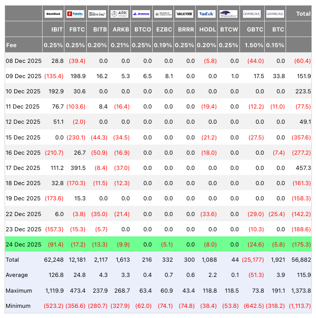 24 декабря волна оттоков из спотовых биржевых фондов (ETF) на базе биткоина (BTC) увеличилась до пяти дней. За этот период клиенты вывели из инструментов суммарно $825,7 млн, в том числе $175,3 млн в среду, согласно Farside Investors.
