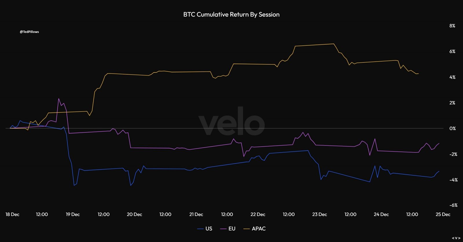 Кумулятивная доходность BTC/USD по сессиям. Источник: Тед Пиллоуз.