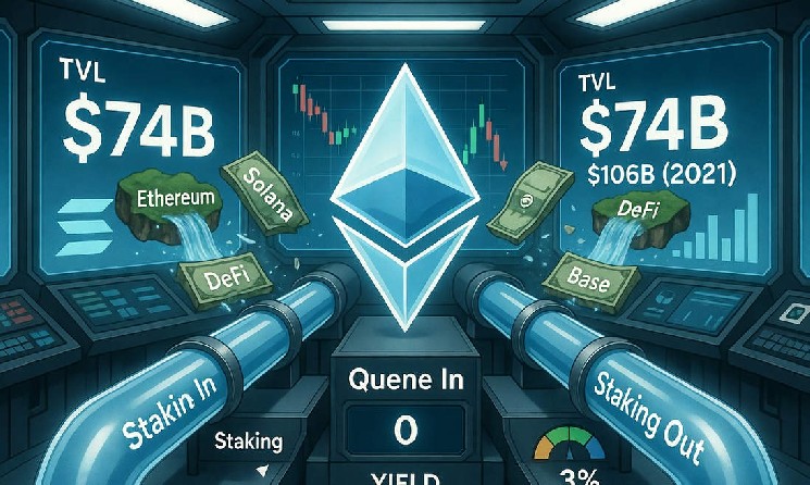 CoinDesk indica que el valor total bloqueado (TVL) de DeFi en Ethereum se ubica alrededor de USD $74.000 millones, un nivel inferior a su máximo cercano a USD $106.000 millones en 2021. La cifra se atribuye a datos de DeFi Llama, según la publicación. Este contraste suele encender debates sobre si Ethereum está perdiendo tracción o si el mercado solo se volvió menos apalancado.
