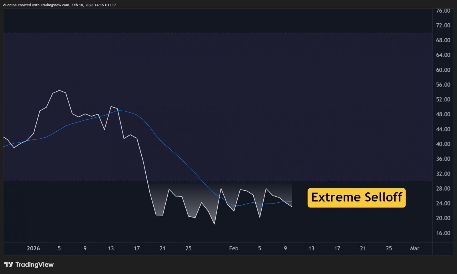 Desde el 20 de enero, el RSI diario se mantiene en la zona de sobreventa por debajo de 30. Lo más preocupante es que ha permanecido allí desde entonces. Esto señala una presión vendedora extrema que no permitió ninguna recuperación del precio. Es razonable esperar mínimos más bajos mientras esta condición persista.