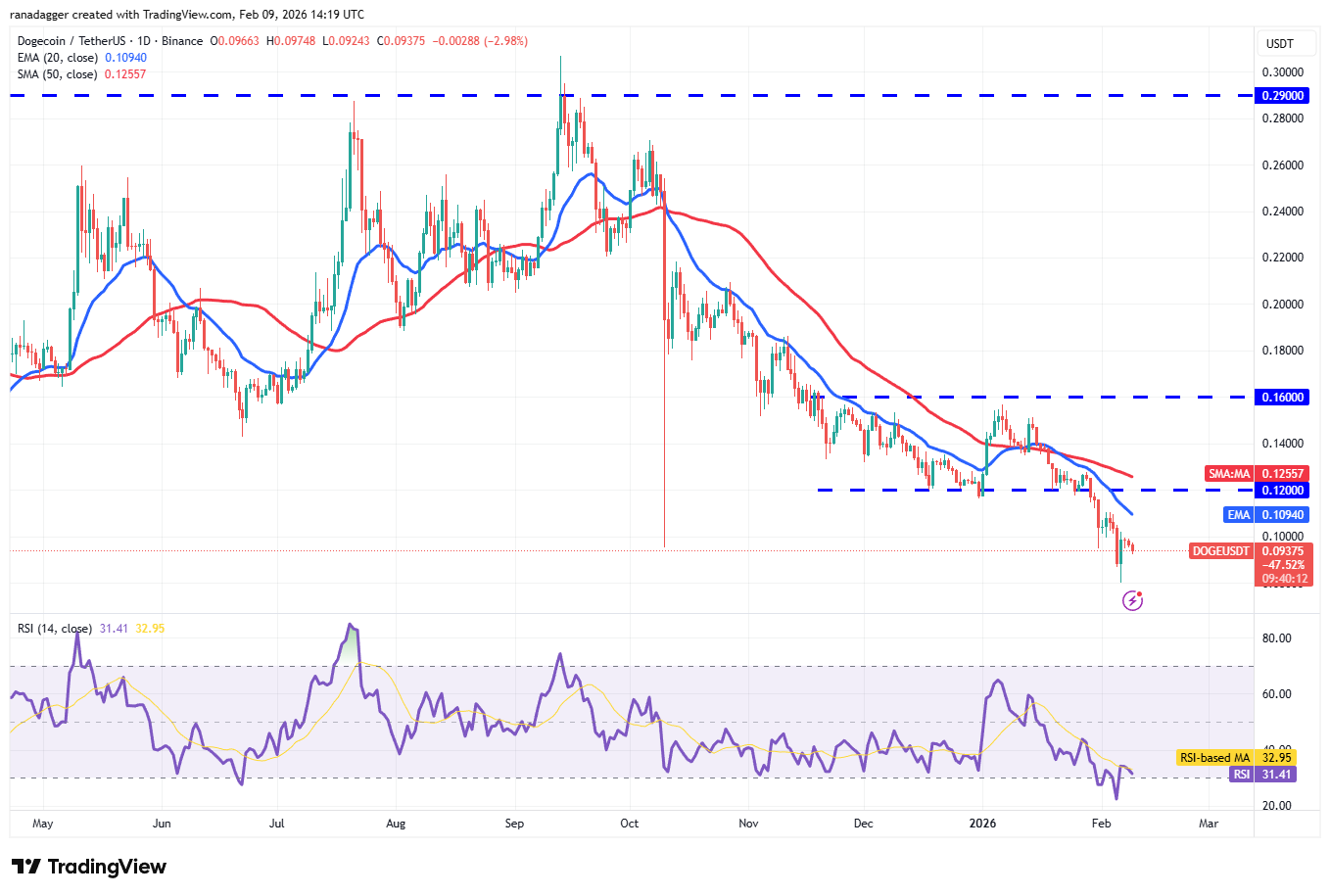 Gráfico de velas diarias del par $DOGE/$USDT. Fuente: Cointelegraph/TradingView