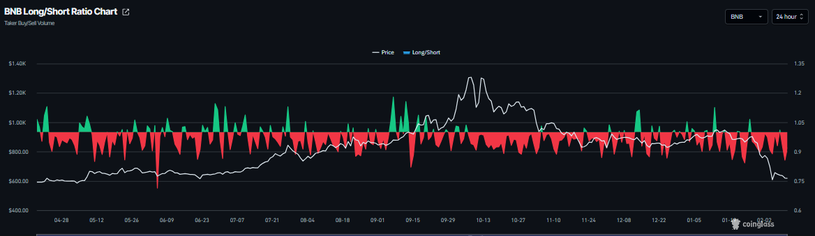 Los datos de derivados de $BNB muestran una perspectiva bajista. La relación larga-corta de CoinGlass para $BNB es de 0.91 el miércoles. Esta relación, que está por debajo de 1, indica un debilitamiento del sentimiento del mercado, ya que más operadores están apostando a que el precio de $BNB caerá.