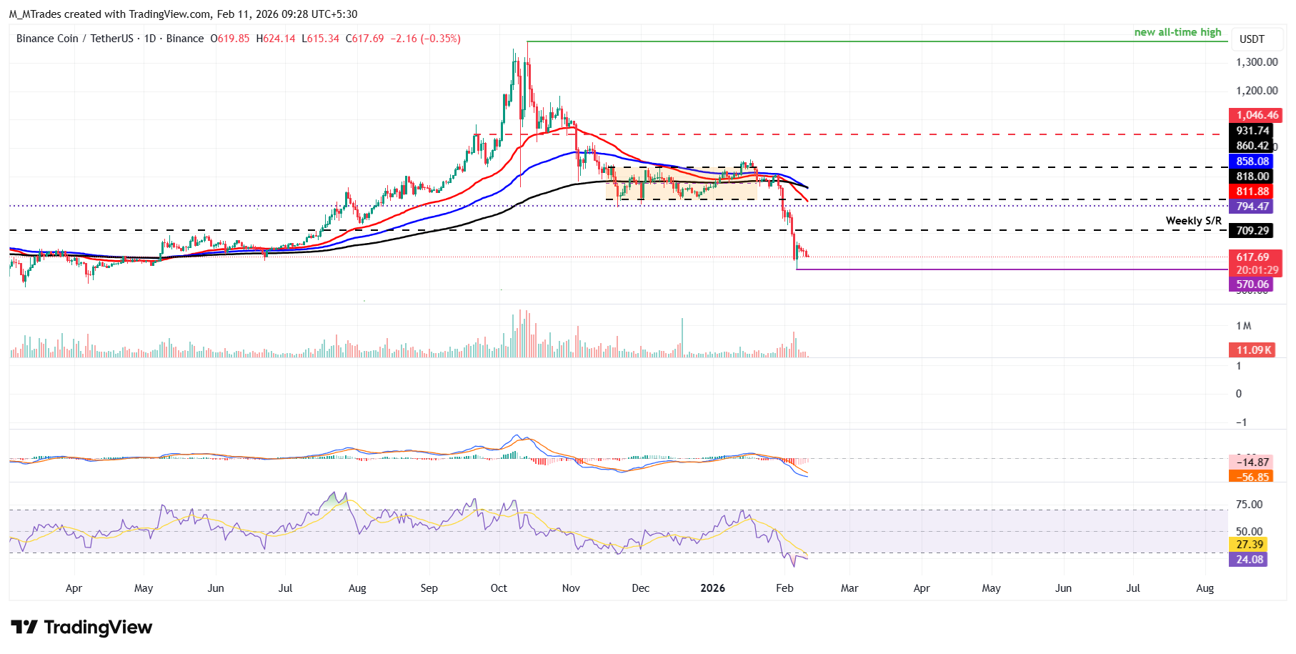 El precio de $BNB corrigió bruscamente la semana pasada, alcanzando un mínimo de 570.06$ el viernes antes de recuperarse ligeramente, luego reanudó su caída, cerrando la semana con una pérdida del 15.64%. $BNB extiende su retroceso, deslizándose casi un 4% hasta el miércoles.