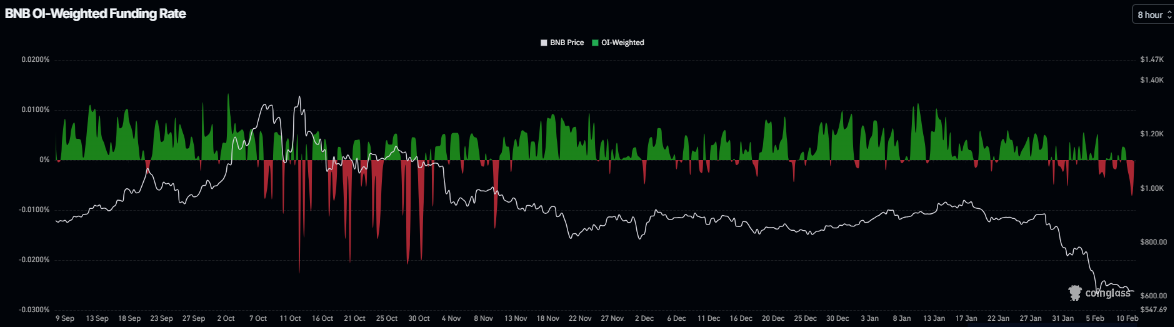 Los datos de la Tasa de Financiación Ponderada por OI de CoinGlass muestran que el número de operadores que apuestan a que el precio de $BNB caerá más es mayor que aquellos que anticipan un aumento del precio.