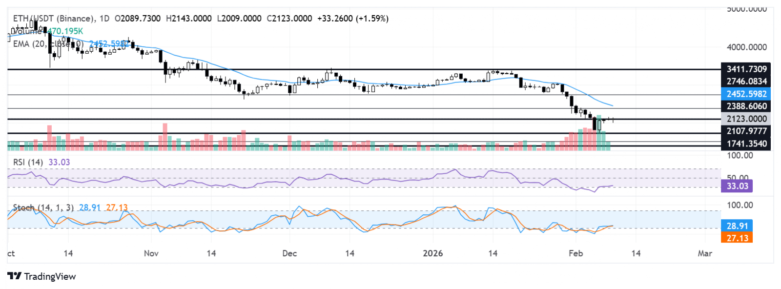 $ETH mantuvo el nivel psicológico de 2.000$ durante el fin de semana y está intentando subir por encima de los 2.100$. En el lado positivo, $ETH enfrenta resistencia en 2.388$, justo por debajo de la Media Móvil Exponencial (EMA) de 20 días.