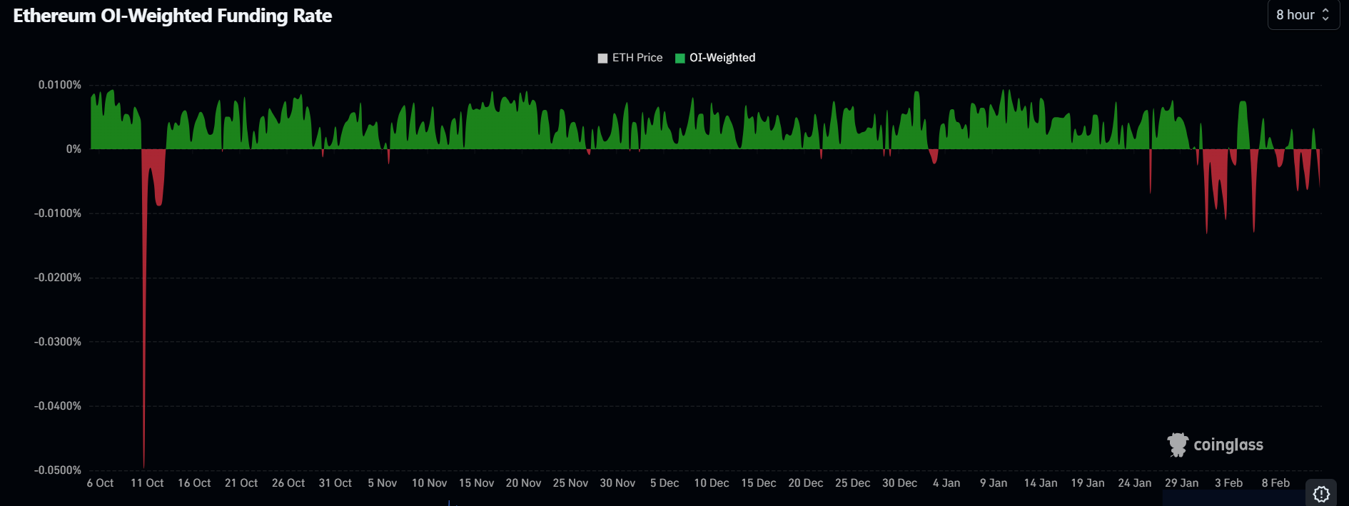 En el lado de los derivados, las tasas de financiamiento de Ethereum han permanecido en gran medida negativas en los últimos días, con un posicionamiento bajista dominando la acción del precio de los futuros, según datos de Coinglass.