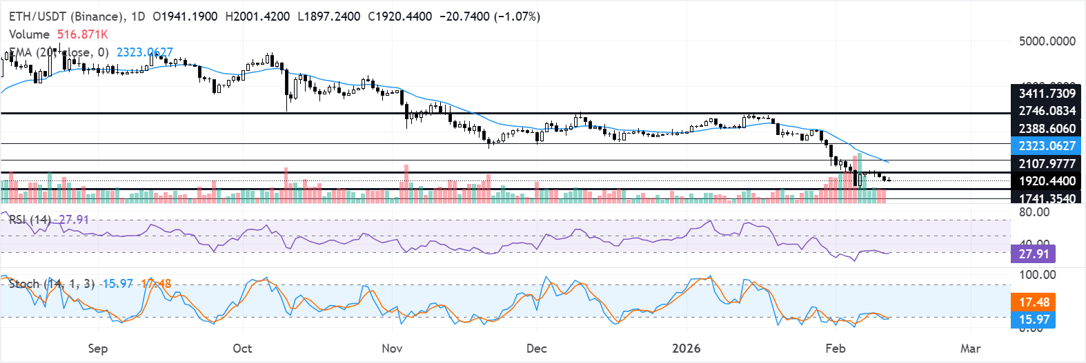 En el gráfico diario, $ETH/$USDT cotiza alrededor de 1.920$. El precio permanece atrapado por debajo de una EMA de 20 días en declive de 2.323$, reforzando un tono bajista a corto plazo. La pendiente descendente de la media continúa limitando los rebotes.