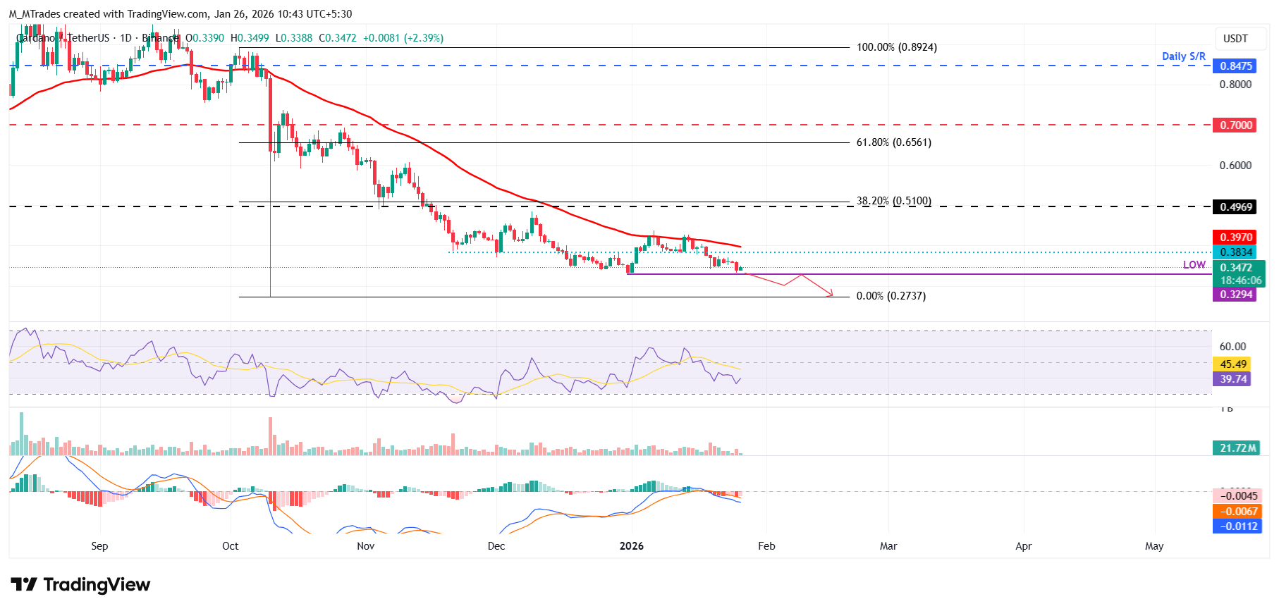 El precio de Cardano enfrentó un rechazo en la media móvil exponencial (EMA) de 50 días en 0.39$ el 14 de enero y cayó casi un 10% en los siguientes cuatro días, cerrando por debajo del soporte diario en 0.38$. ADA continuó su corrección, cayendo más de un 9% la semana pasada. Al momento de escribir el lunes, ADA se sitúa alrededor de 0.34$.