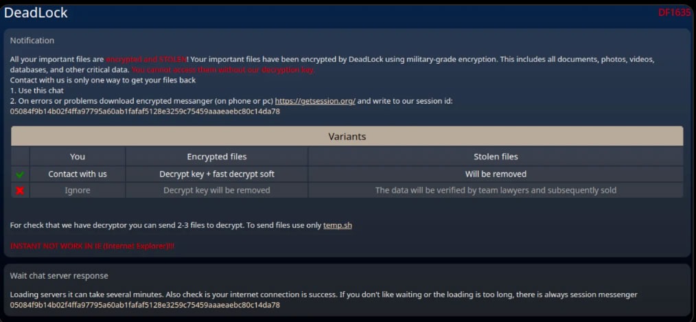 Una vez que las víctimas han sido infectadas con el malware y se ha producido el cifrado, DeadLock las amenaza con una nota de rescate y la venta de datos robados si no se cumplen sus exigencias.