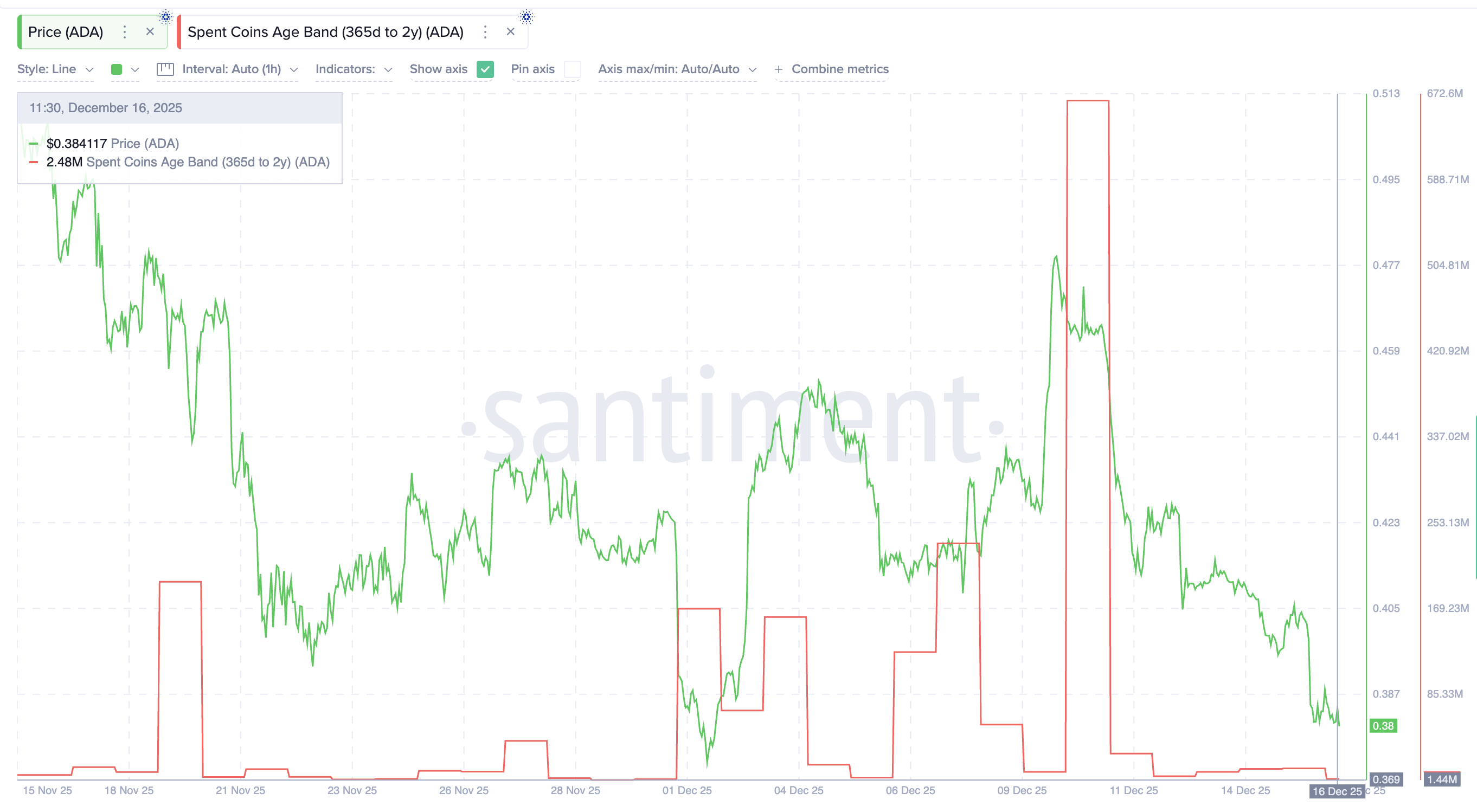 Во-вторых, стабилизировалось поведение долгосрочных инвесторов. Группа держателей, владеющих монетами от одного года до двух лет, практически прекратила перемещение средств. Согласно метрике Spent Coin, объем монет, задействованных этой категорией инвесторов, упал с 666,24 млн ADA до 2,48 млн ADA начиная с 10 декабря.