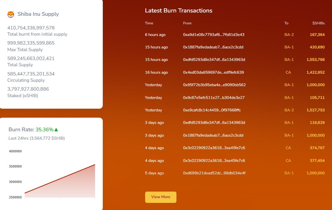 The Shibburn website shows that since last morning, there have been four burn transactions. The largest of them carried 1,553,766 $SHIB and 1,422,952 $SHIB meme coins to dead-end wallets. This constitutes nearly 2x surge from yesterday’s burns, when only slightly more than 2 million $SHIB were locked out of the total circulating supply.