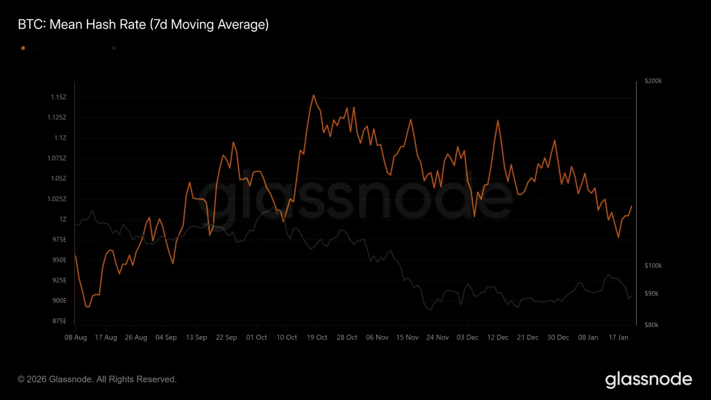 На момент написания хешрейт биткоина удерживается выше отметки 1 ZH/s. Согласно Glassnode, сглаженный семидневной скользящей средней хешрейт биткоина находится на уровне 1,01 ZH/s. 17 января значение достигало локального дна у 977 EH/s.