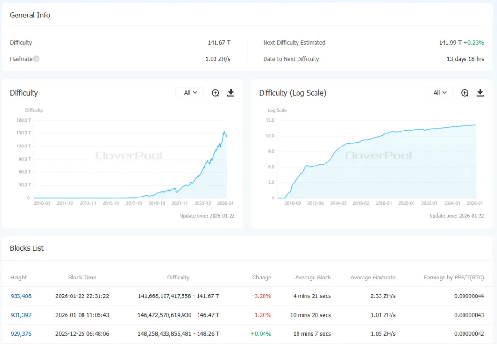 22 января в результате очередного перерасчета сложность майнинга первой криптовалюты снизилась на 3,28% — до 141,67 Т.