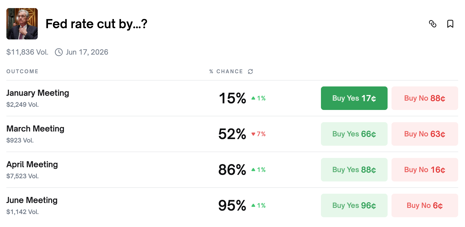 Данные Polymarket показывают: вероятность снижения ставки в январе составляет всего 15%, а в марте — уже 52%.