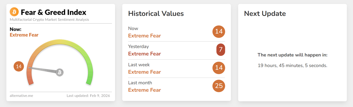 Схожее разочарование фиксируется и по индексу страха и жадности, который остается в зоне экстремального страха. Перед выходными индикатор опустился до минимальных с момента коллапса экосистемы Terra 7 п., а сейчас отскочил к 14 п.