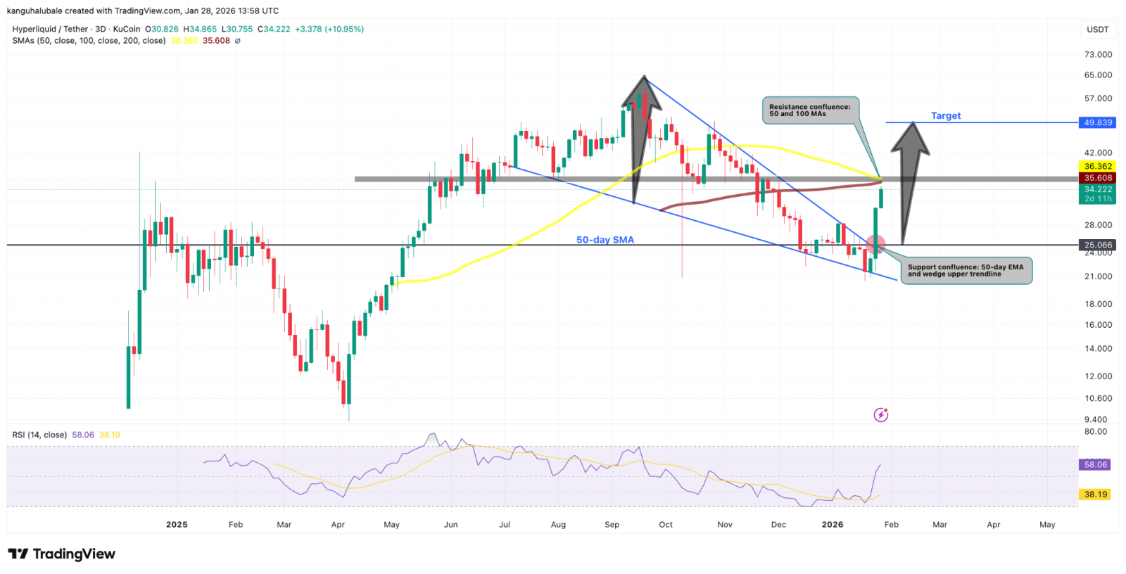 Тем временем $HYPE подтвердил пробой многомесячной модели нисходящего клина — фигуры, которую обычно рассматривают как сигнал бычьего разворота.