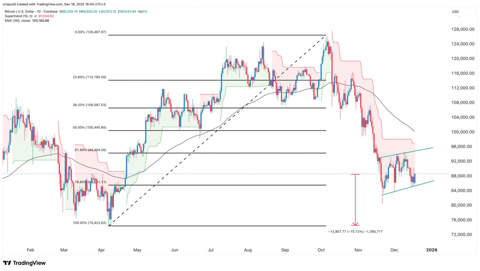 Der Bitcoin-Kurs geriet am Freitag unter starken Verkaufsdruck, als die Bank of Japan (BoJ) ihre letzte Zinsentscheidung in diesem Jahr bekannt gab. BTC fiel auf 85.800 $ und damit unter den Höchststand von 94.650 $ in diesem Monat, was ~30% unter dem Höchststand in diesem Jahr liegt.