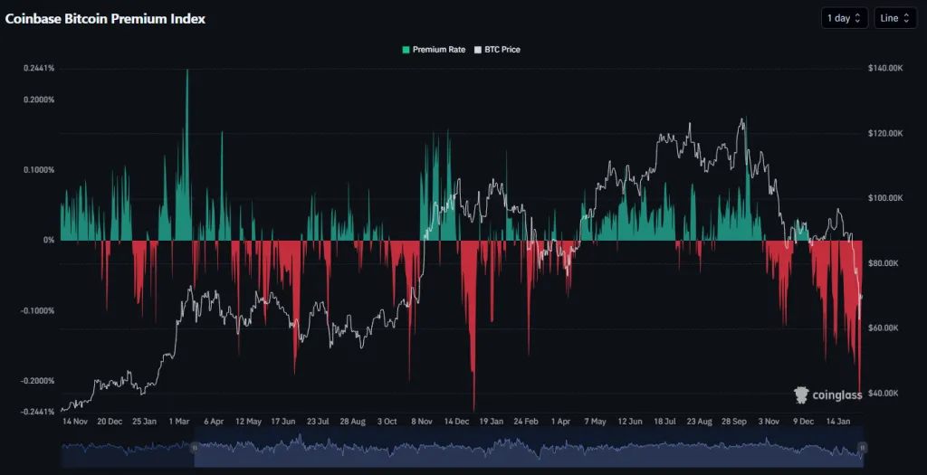 Coinbase Premium рассматривается аналитиками как прокси для оценки потоков институционального и долларового капитала. Глубокий дисконт обычно сигнализирует об агрессивных продажах со стороны игроков из США или их уходе с рынка.