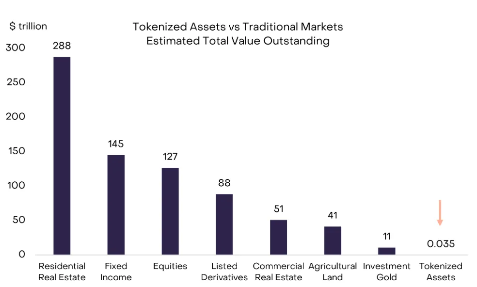 Аналитики Grayscale спрогнозировали рост сектора RWA в 1000 раз к 2030 году. Сейчас доля токенизированных инструментов составляет всего 0,01% от глобального рынка акций и облигаций.