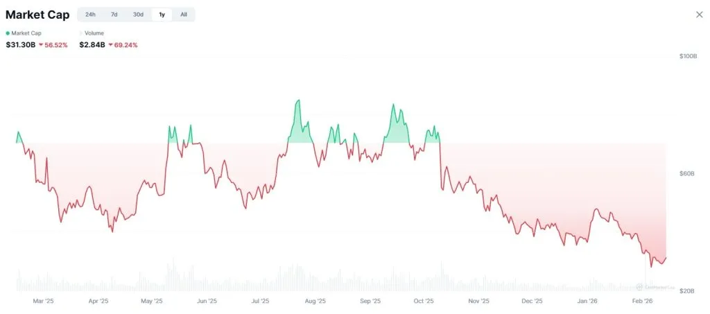 По данным CoinMarketCap, за последние 12 месяцев капитализация сегмента мем-коинов сократилась на 56,5% — до $31,3 млрд. Объем торгов за период обвалился на 69%.