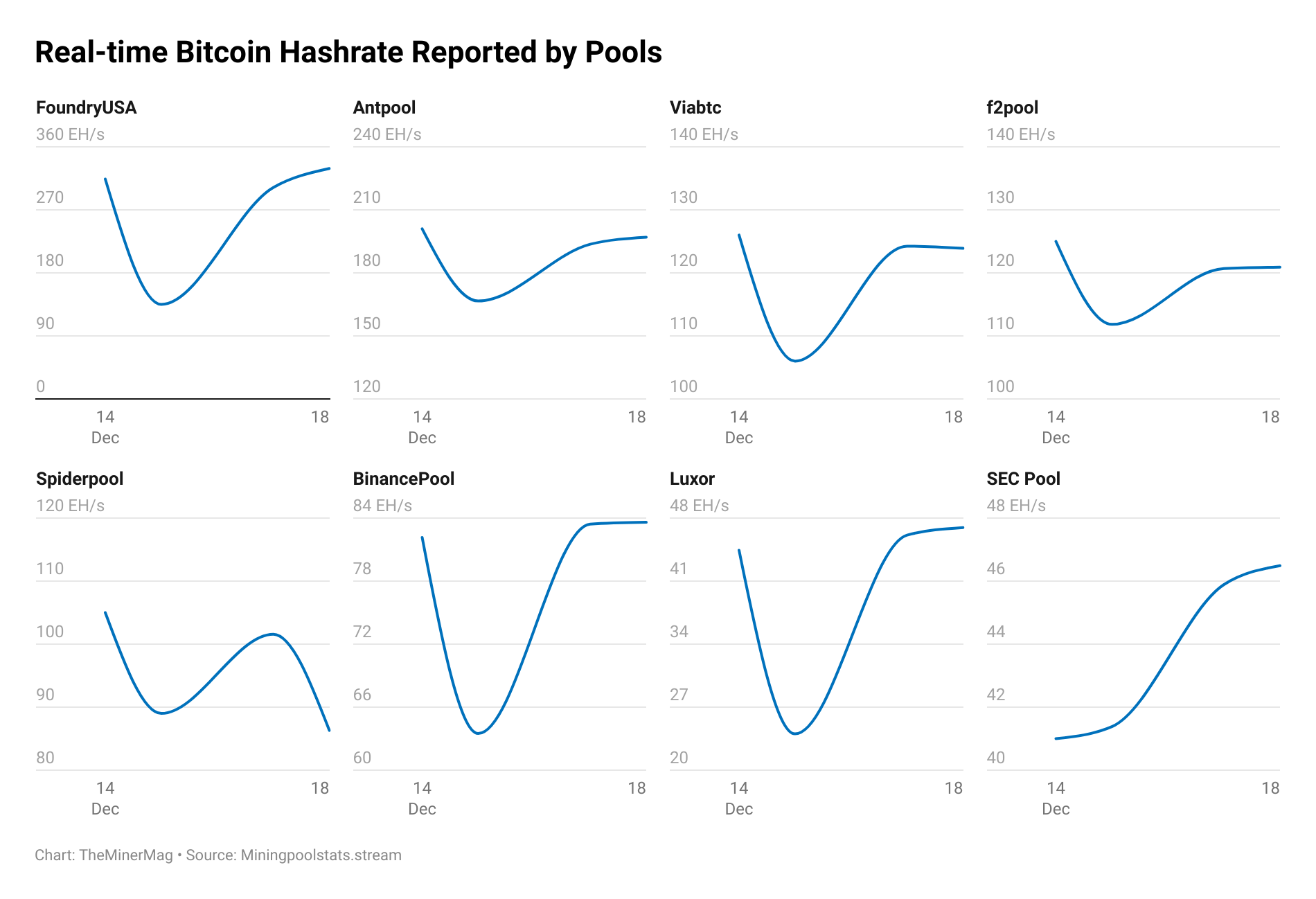 Data from TheMinerMag shows that the largest pool-level declines during Monday’s disruption came from North America, with Foundry USA alone reporting an estimated 180 EH/s drop in hashrate.